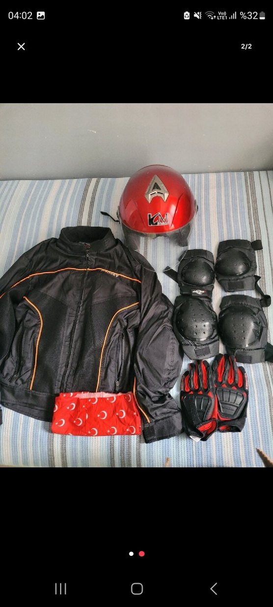 Kırmızı deri motosiklet kask dizlik dirseklik eldiven boyunluk mevsimlik ceket sıfır ürün sadece etiket yok