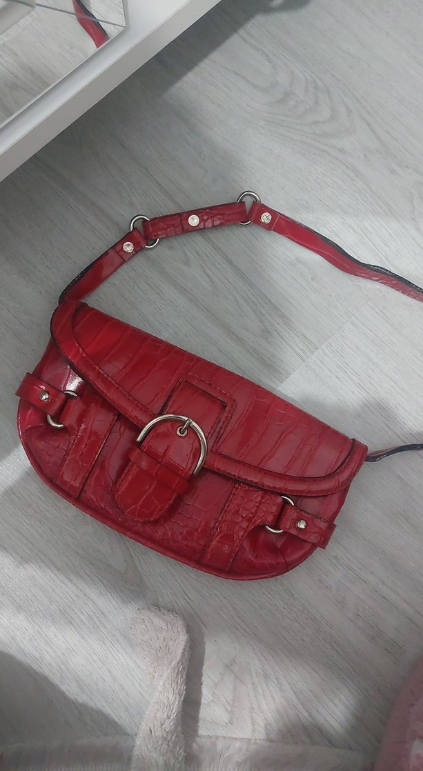 Kırmızı deri, parlak snake print dokulu, tokalı kapaklı kadın çanta, trend sokak stili için uygun.