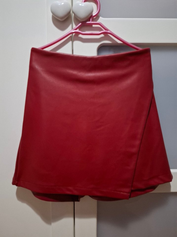 kırmızı deri şort etek