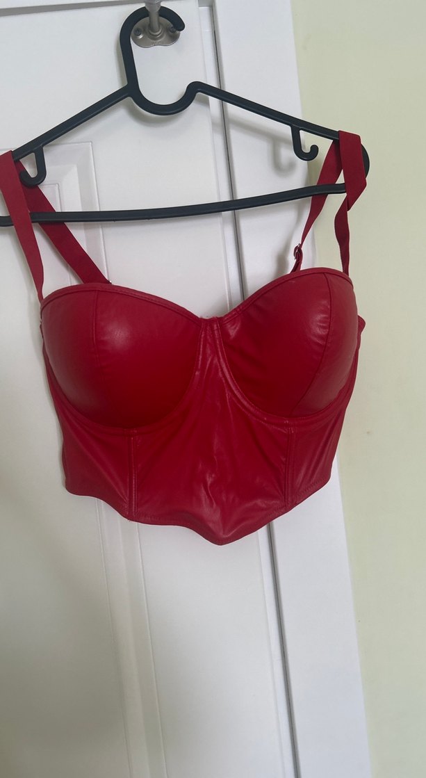 Kırmızı deri, straplez yaka ve ayarlanabilir askılı, buckled detaylı, parlak görünümlü bustiyer. Romantik akşamlar için uygundur. ❤️