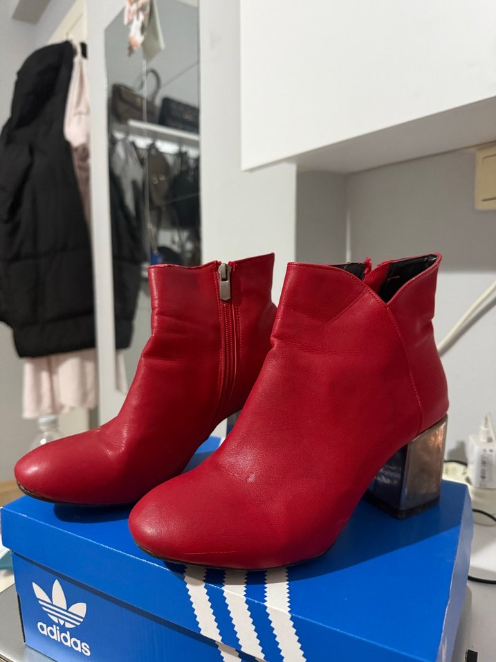 Kırmızı deri, tokalı kadın botlar blok topuklu ve minimal tasarımlı. Romantik akşamlar için şık ve renkli bir tercih.