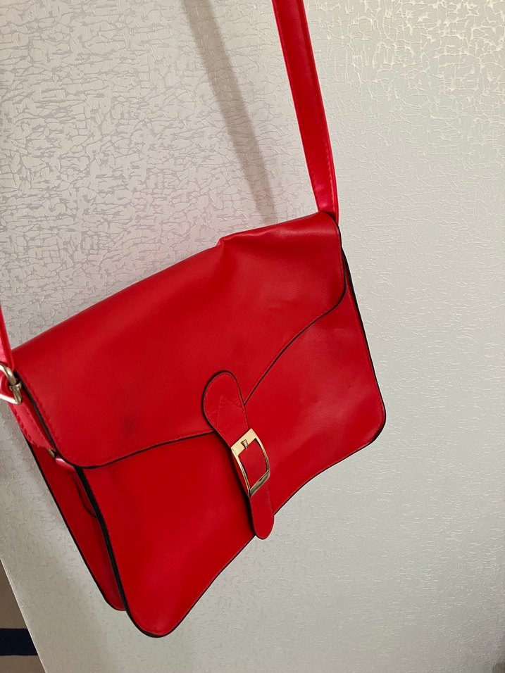 Kırmızı deri, tokalı kapaklı kadın çantasıdır. Minimalist, desen içermeyen, çağdaş tarzdadır ve günlük kullanım için uygundur. Sade ve canlı renklidir.