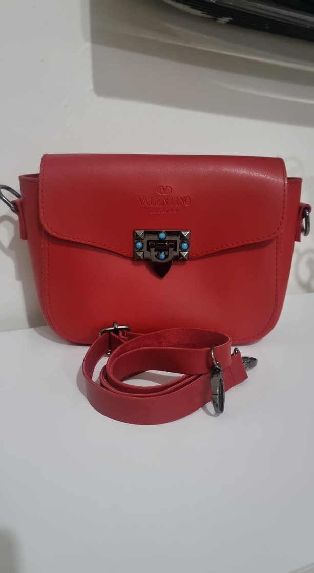 Kırmızı deri tokalı kadın çanta, modern klasik tarzda, renkli baskılı tasarıma sahip, günlük kullanıma uygun. Valentino garavani