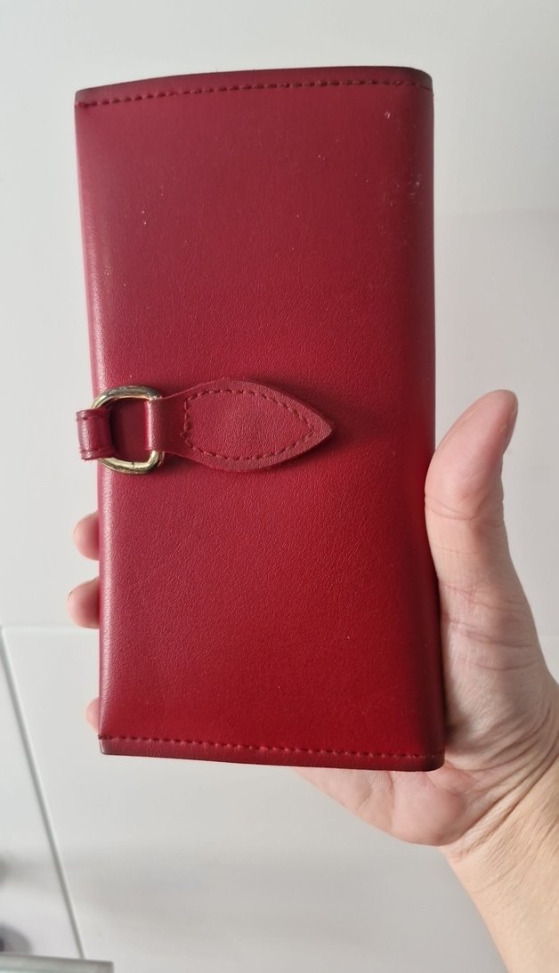 Kırmızı deri tokalı kadın cüzdanı, parlak ve düz yüzeye sahip. Minimalist ve bohem tarzıyla günlük kullanıma uygun.