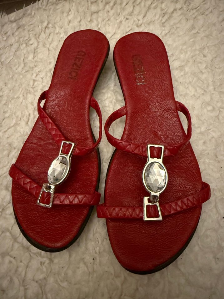 Kırmızı deri, parlak yılan desenli, tokalı bantlı kadın sandaletleri. Dolgu topuklu ve bohem tarzda, günlük kullanıma uygundur.