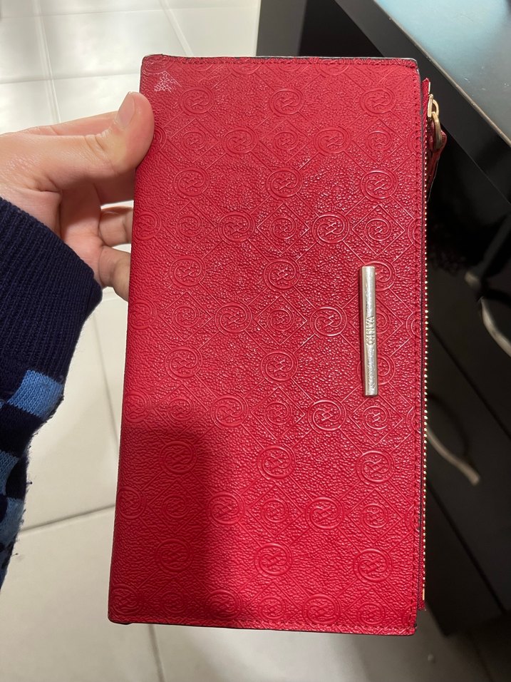 Kırmızı deri yılan desenli, fermuarlı kadın cüzdanı, modern klasik tarz ve Paris şıklığını yansıtarak günlük kullanıma uygundur.