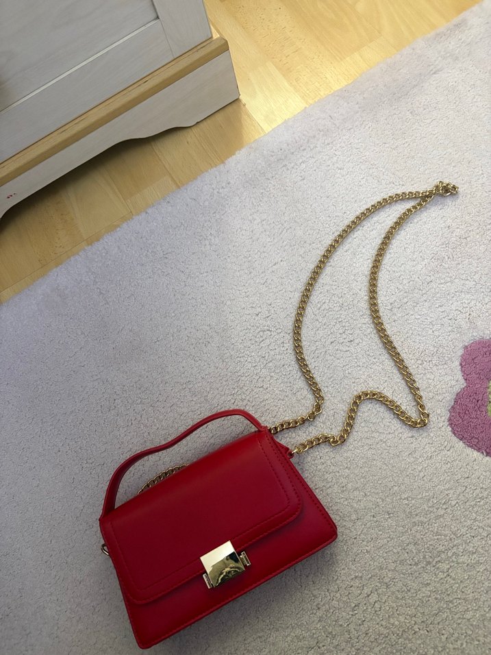 Parlak kırmızı deri, yılan derisi desenli ve zincir detaylı bu kadın çanta modern klasik ve cesur minimalist tarzı yansıtıyor. Günlük kullanıma uygun.