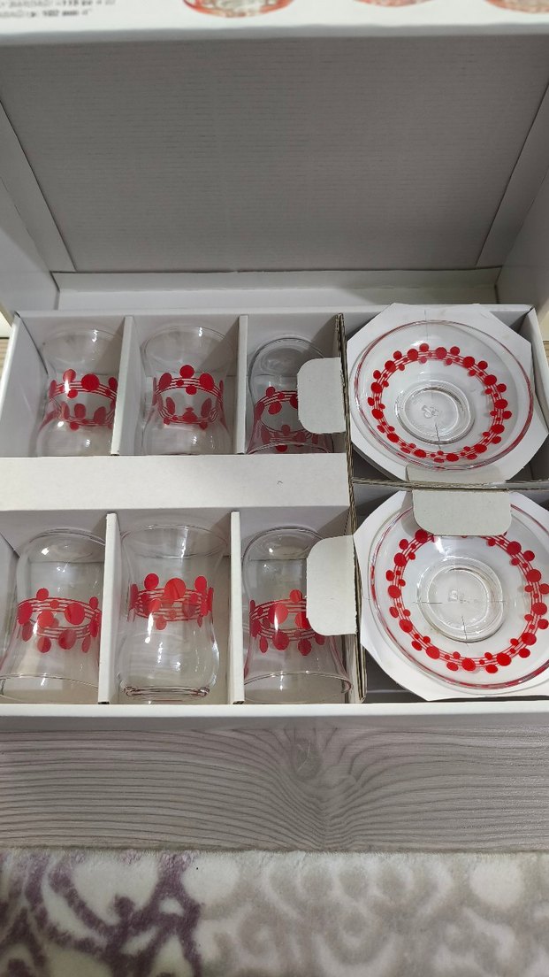 Altı adet kırmızı desenli cam çay bardağı ve uyumlu tabaklardan oluşan set. Çay servisi için uygun.