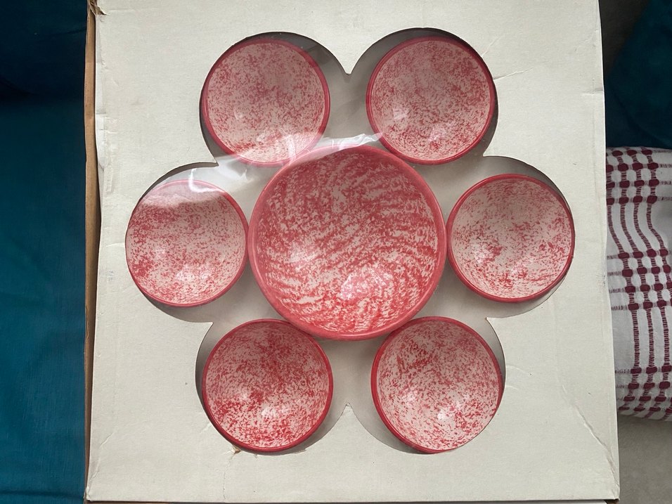 Kırmızı benekli desene sahip 7 parça servis kasesi seti. Kaseler pürüzsüz yüzeye sahip ve çiçek şeklinde düzenlenmiştir. ️