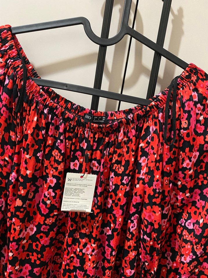 Kırmızı desenli, viskon kumaştan üretilmiş, bol kesim bluz. Hediye geldi. Hiç kullanılmadı etiketli. Kayık yaka s beden ama m bedene de olur çok şık çok tatlı yaz akşamları ya da günlük kullanılabilir