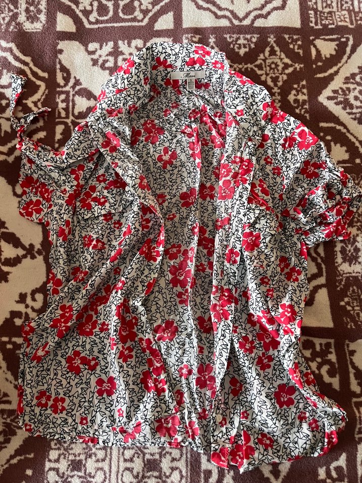 Kısa kollu, yakalı bohem kadın kimono. Kırmızı desenli, bol kesim ve drapeli tasarım. Midi boyda, retro ve hippie tarzı günlük kullanım için uygun.