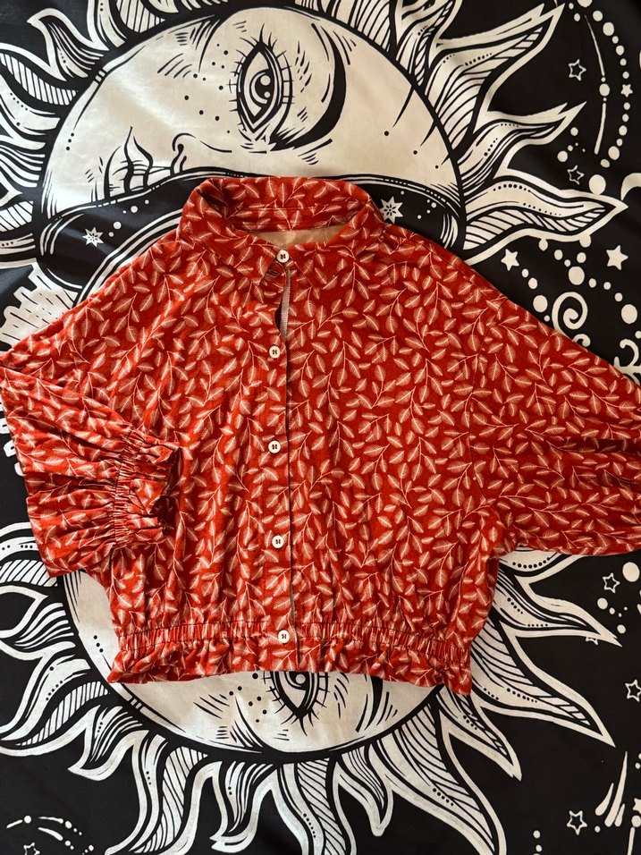 Kırmızı renkli, desenli kadın gömleği yüksek yakalı ve uzun kolludur. Bol kesimli, düğmeli ve kısa boyda olup bohem tarzını yansıtır. Tekstilden yapılmıştır, renkli ve günlük kullanıma uygundur.