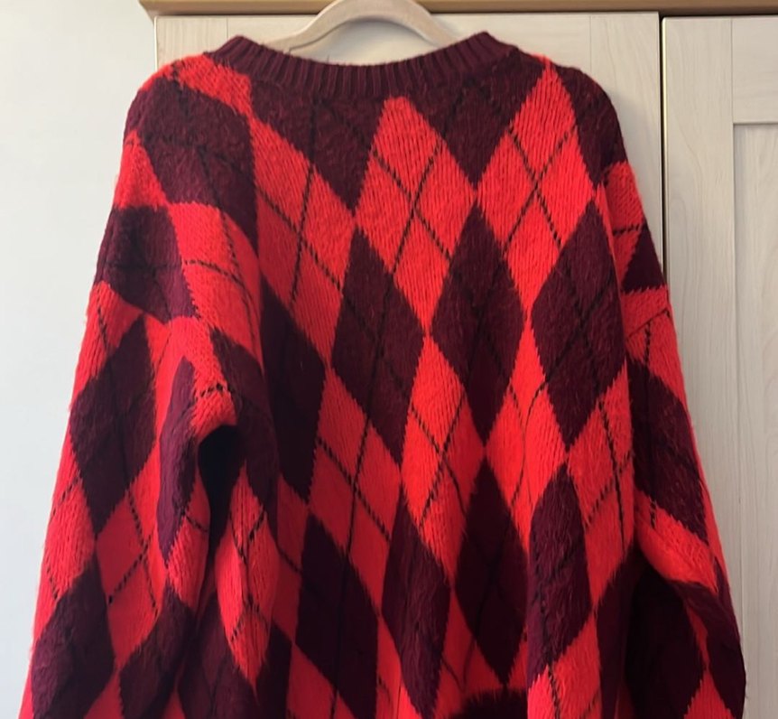 Koyu kırmızı desene sahip, uzun kollu, bohem tarzda rahat kesimli kadın triko kazak. Günlük kullanıma uygun, örme kumaştan üretilmiştir.