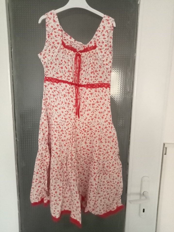 Kolsuz, V yakalı, oturan kesim bohem midi elbise. Hafif sentetik kumaş, kırmızı desen ve fırfır detaylarıyla günlük kullanıma uygun.