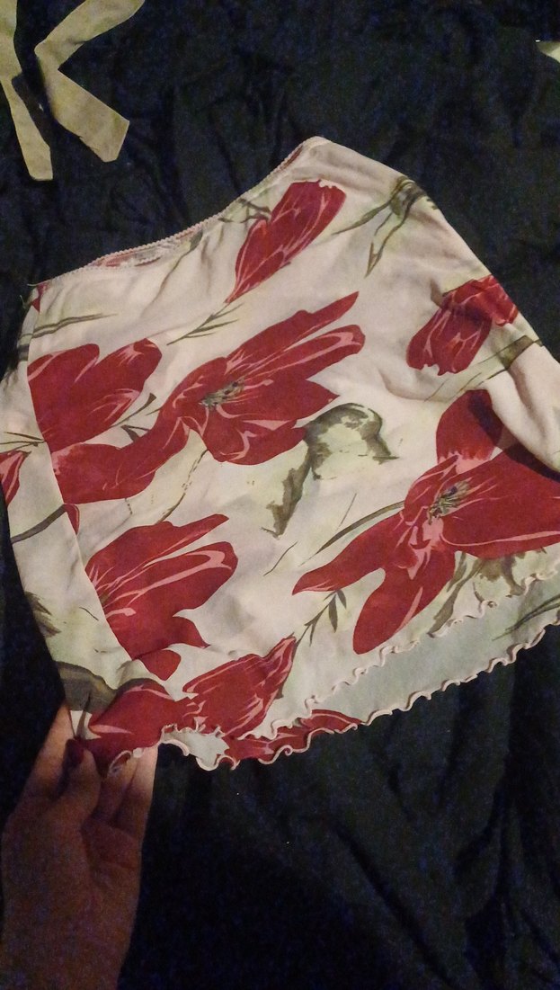 Hafif kırmızı çiçek desenli, yumuşak sentetik kumaştan yapılmış, drapeli, vücuda oturan, romantik bir akşam için uygun astari var yine