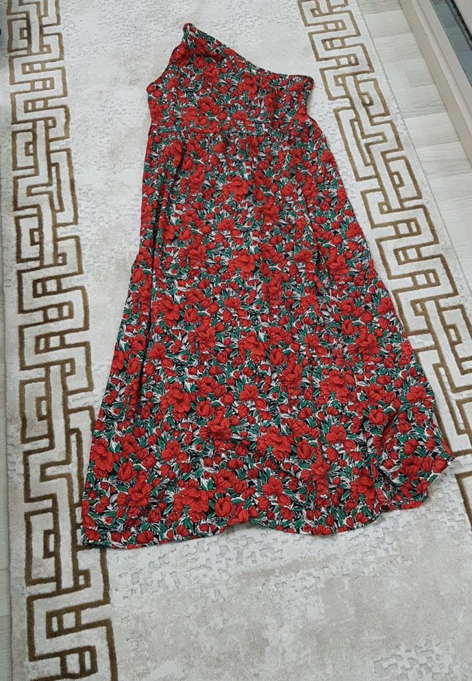 Kırmızı desenli, askısız ve kolsuz, bol kesimli, drapeli bohem tarzda uzun elbise.