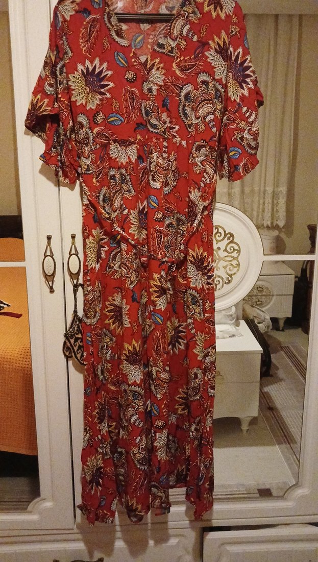 Kırmızı renkli, bol kesim, drapeli kısa kollu ve V yaka uzun elbisedir. Yumuşak dokulu, desenli kumaştan yapılmıştır, günlük kullanıma uygundur.