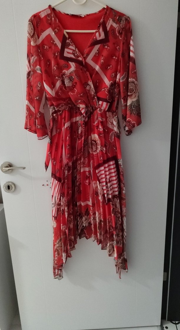 Kırmızı desene sahip bu uzun elbise, bol kesim, pileli detaylar ve V yakalı askılı kol tasarımıyla bohem tarz sunar.