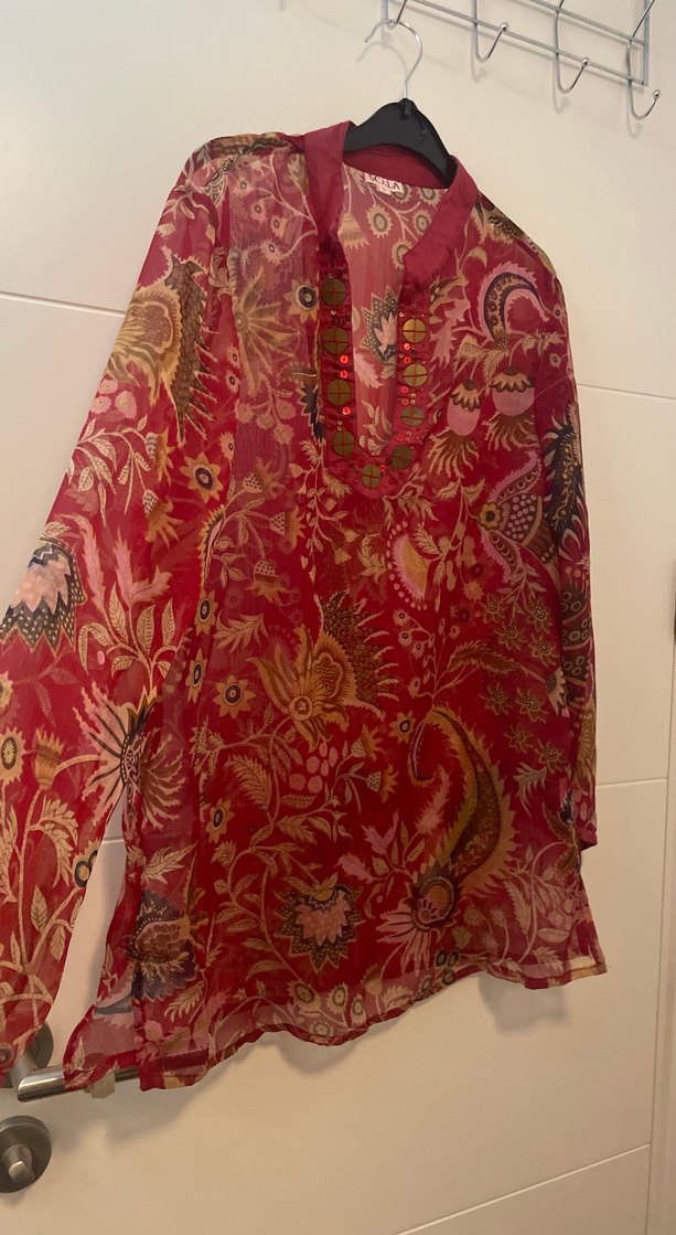 Kırmızı, desenli, bol kesim ve uzun kollu bohem tunik. V yaka ve dökümlü tasarımıyla romantik akşamlar için uygun.