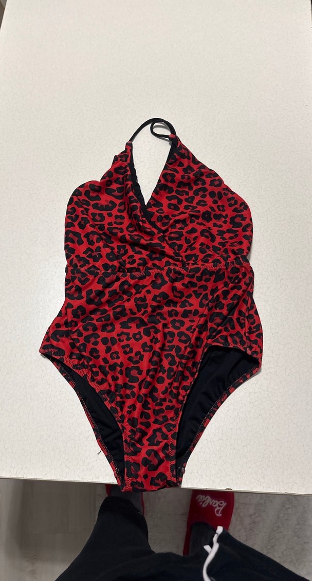 Kırmızı Desenli Drapeli Kadın Mayo