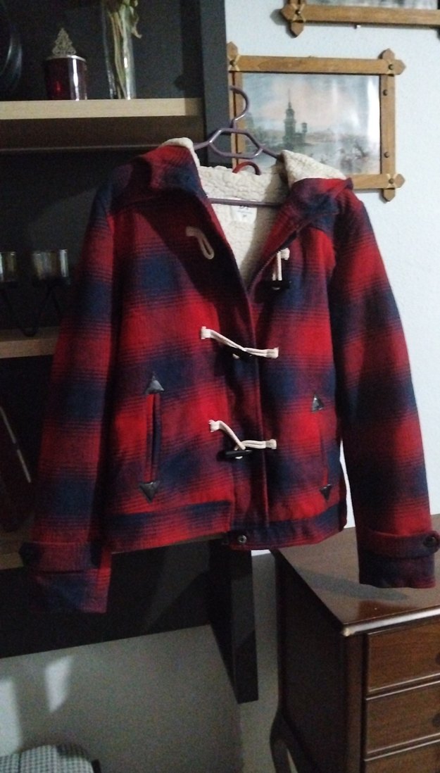 Düğmeli, notched lapel yakalı ve salaş kesimli kadın ceketi. Koyu kırmızı ekose Yumuşak ve sıcak kumaştan yapılmıştır.