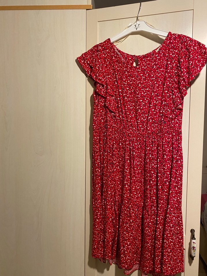 Renkli kırmızı elbise, kısa fırfırlı kollu. Yumuşak kumaş hiçbir deformu yoktur. 2-3 kez giyilmiştir. Vitrin markası. belden oturmalı elbise
