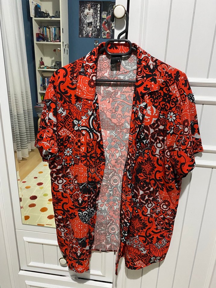 Koyu kırmızı desenli, kısa kollu, düğmeli gömlek. Notch yakalı, bohem tarzda günlük kullanım için uygun.