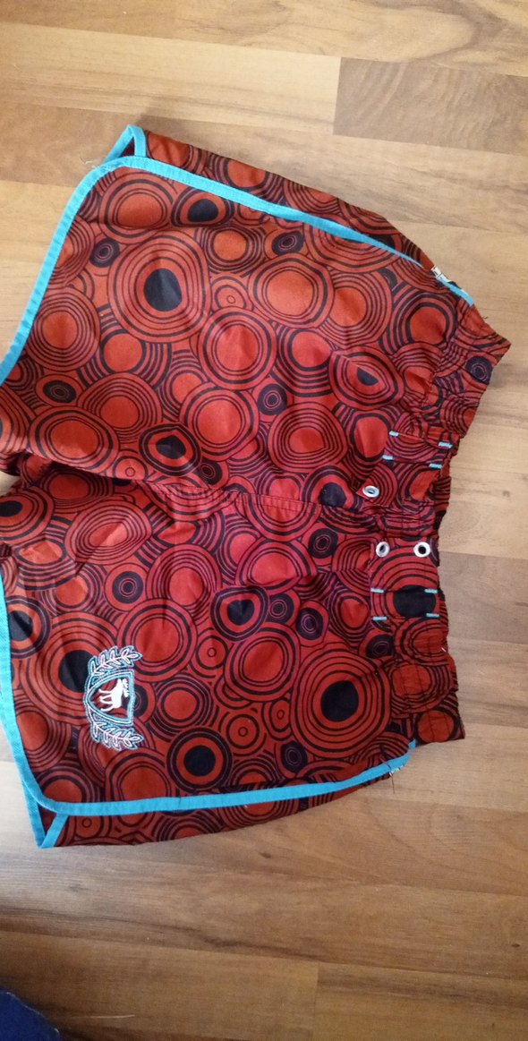 Koyu kırmızı desenli, düğmeli detaylı, bol kesim erkek mini mayo, plaj için uygun. ✨ 8 9 yaş