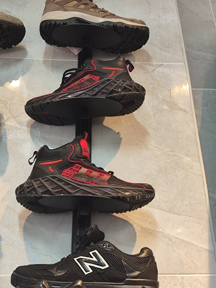 Kırmızı desenli, koyu tonlarda erkek spor ayakkabısı. Velcro bantlı ve kauçuk tabanlı, trend sokak stili için uygun.