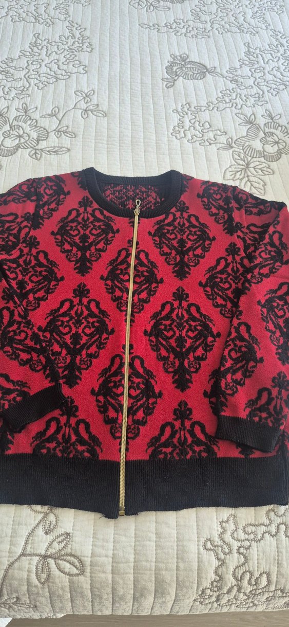 Bu dar kesim kadın kazak, koyu kırmızı desenli örme kumaş, ön fermuar ve uzun kollu olup, gotik esintili Paris tarzını yansıtır. Yuvarlak yaka ve normal boydadır.