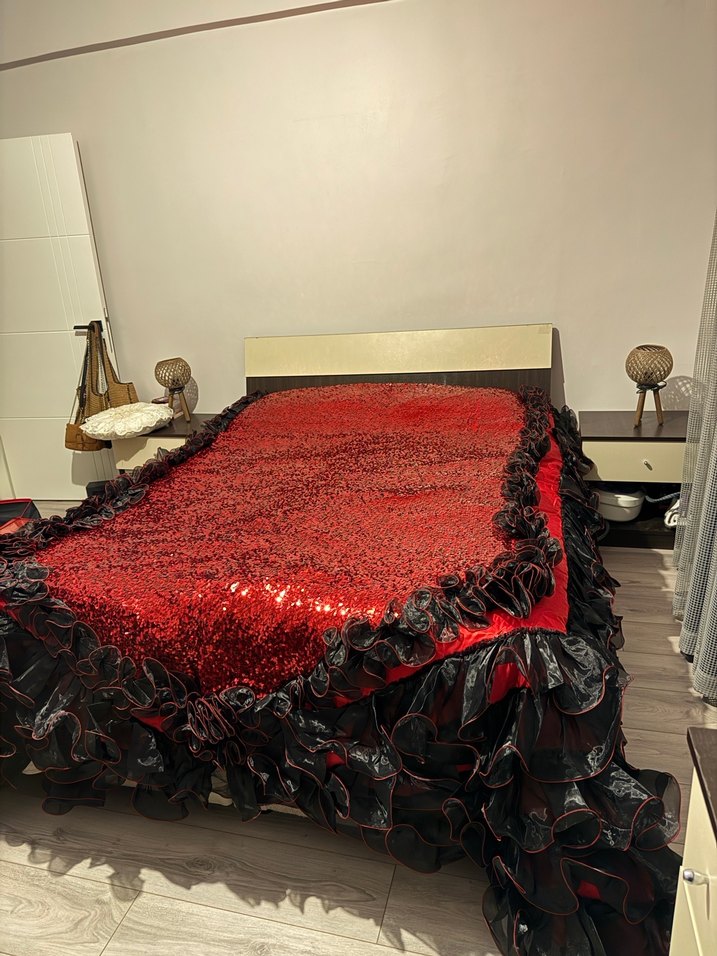 Koyu kırmızı desenli yatak örtüsü, siyah fırfır detaylarıyla yatağa doku ve şıklık katıyor. Hiç kullanılmadı iki tane de yastık kılıfı ve bir tane de pofuduk yuvarlak yastığı var.