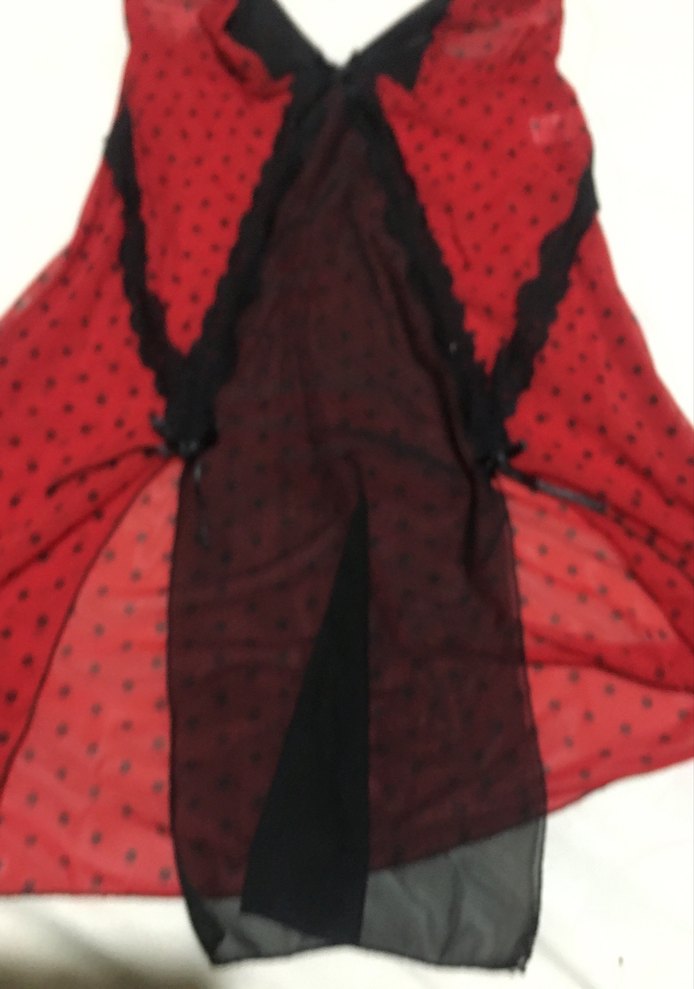 Kırmızı desenli kumaş ve siyah tül detaylı, kolsuz, uzun ve vücuda oturan gotik tarzda kadın gecelik .