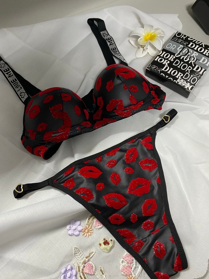 Kırmızı dudak desenli, koyu siyah tabanlı gotik tarzda kısa uzunlukta ve ayarlanabilir askılı sütyen. deri görünümlü