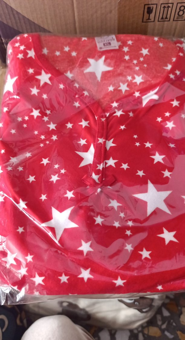 Renkli kırmızı kumaş üzerine beyaz yıldız desenleri bulunan, askılı kollu ve V yaka, normal midi boyda, vücuda oturan hamile ve emzirme geceliği. ⭐