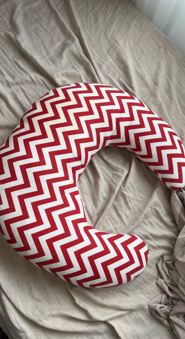 Renkli kırmızı zigzag desenli, yumuşak kumaşlı hamile ve emzirme yastığıdır. Rahatlık ve destek sağlar. ️