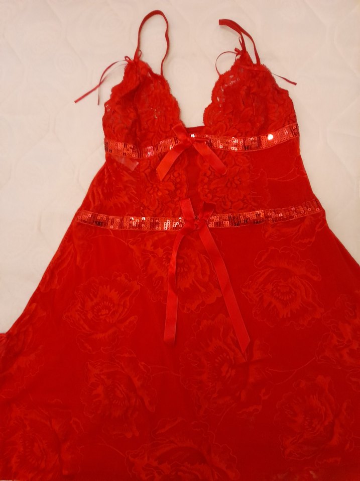 Desenli kumaş, ince askılar, payet detayları ve kurdele süslemeleriyle kırmızı, vücuda oturan midi uzunlukta kadın gecelik.