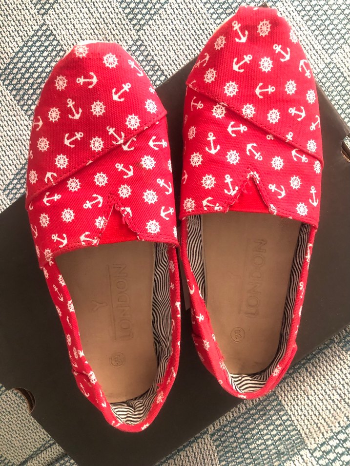 Kırmızı, deniz temalı desenli espadril,gündelik kullanıma uygun renkli tasarım. London marka 39 numara yazsada 38 ler için uygundur kusursuz 1-2 giyildi