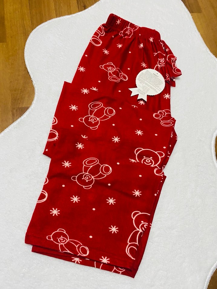 Renkli baskılı ayıcık desenli kırmızı kadın pijama altı, bol kesim ve elastik bel bandına sahiptir.