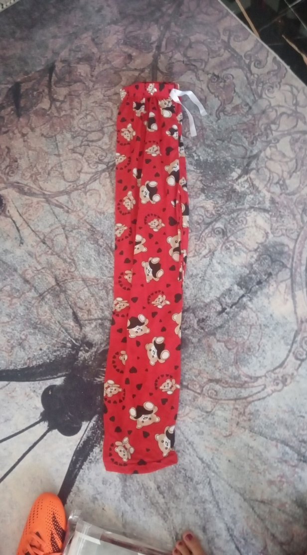 Kırmızı renkte, sevimli karakter desenli, beli lastikli ve beyaz bağcıklı, rahat kesim kadın pijama altıdır. Sokak tarzı için uygundur.