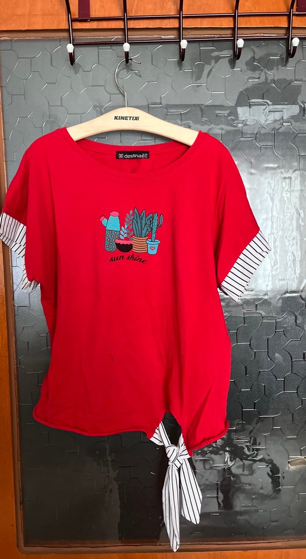 kısa kollu, çizgili manşetli ve önü bağlamalı kırmızı kadın tişörtü. Bitki desenli, rahat kesim ve yuvarlak yaka içerir.