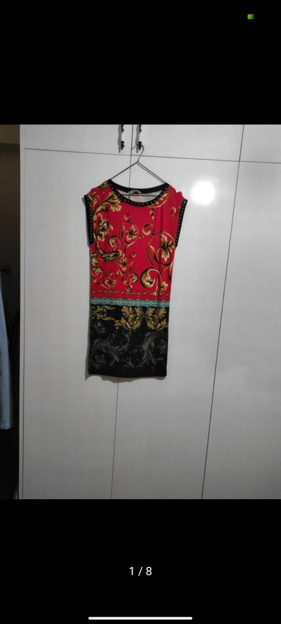 Kolsuz, renkli desenli, dar kesim kısa diz üstü uzunlukta, yuvarlak yakalı yumuşak kumaş şık elbise. gece yemeklerde kullanım için uygundur.