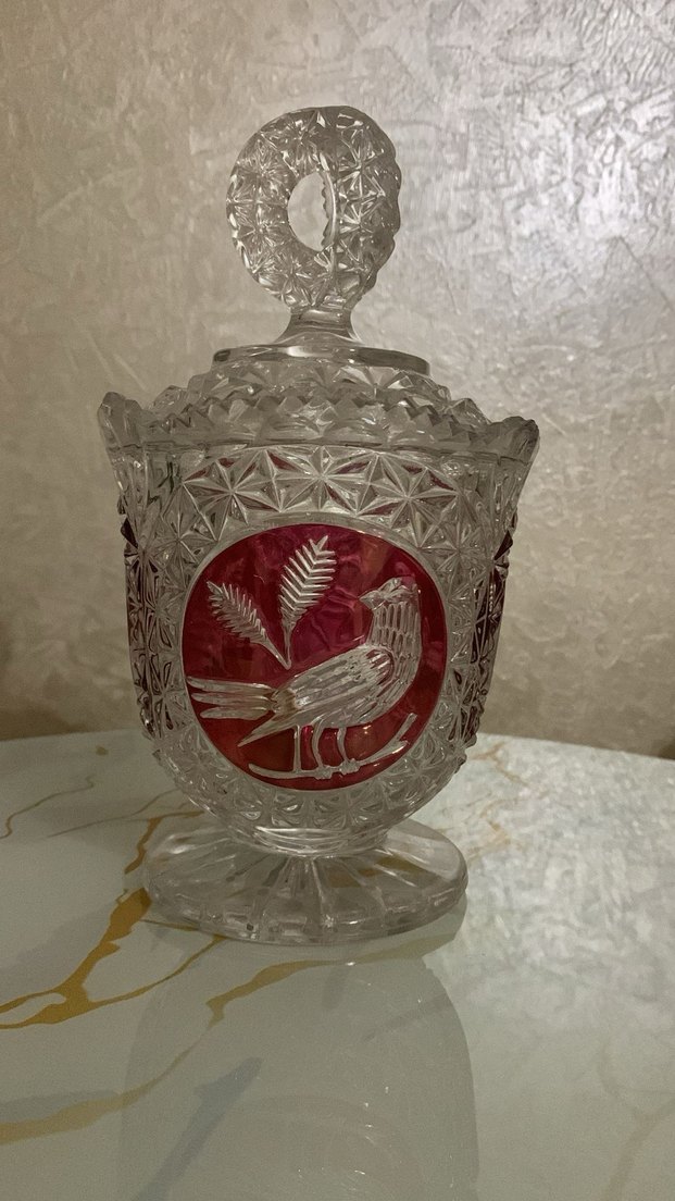 Kırmızı dairesel detayda kuş ve bitki figürü bulunan, kristal kapaklı ve ayaklı vazo.