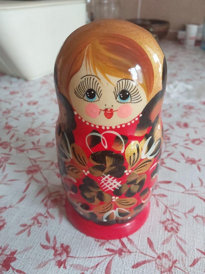 Kırmızı renkli, çiçek desenli ve gülen yüzlü Rus matruşka biblosu.