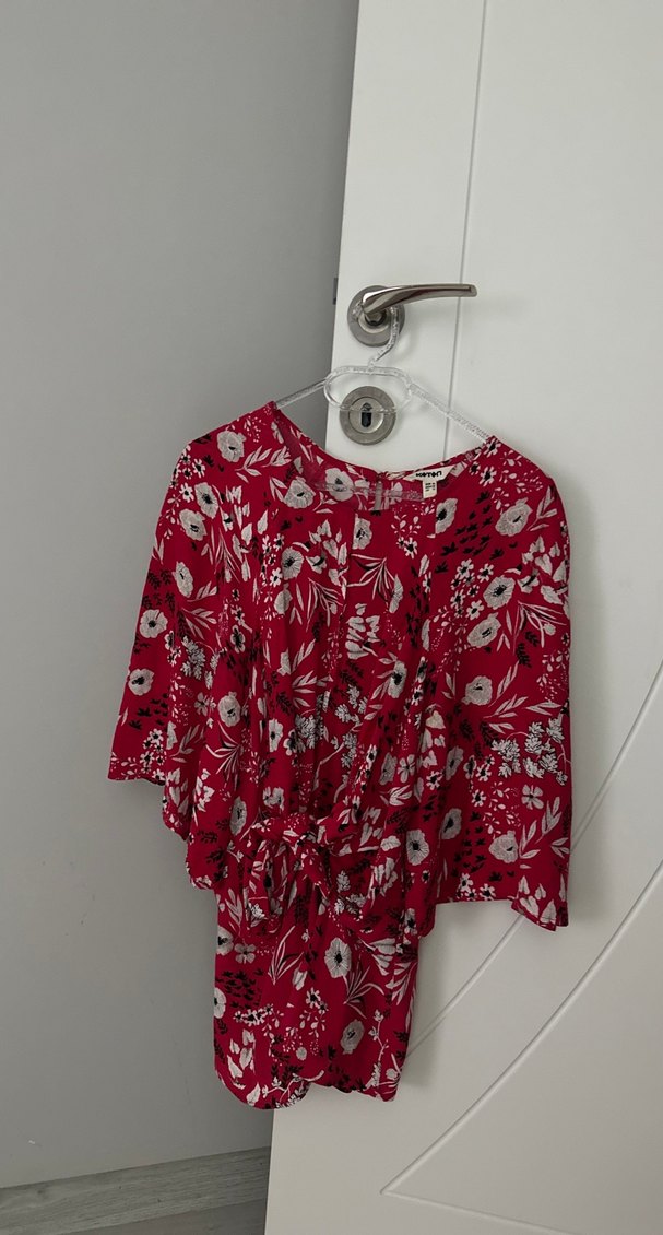 Kırmızı, desenli, kısa kollu ve düğmeli, bol kesim mini bohem bluz. Sentetik kumaştan, günlük kullanıma uygun.