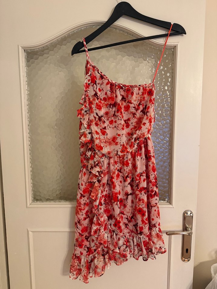 Hafif kırmızı tonlarda, bağlama desenli, volanlı ve bol kesim mini elbise. İp askılı ve straplez yakaya sahip, yumuşak sentetik kumaştan bohem tarzda.