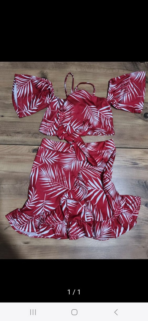 Renkli kırmızı desenli, askılı ve fırfırlı detaylı bol kesim mini bohem mayo elbise.