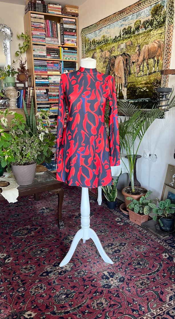 Kırmızı renkte, yüksek yakalı ve uzun kollu. Koyu tie-dye desenli, bohem ve avangart tarzda. Romantik akşamlar için , mini elbise likralı