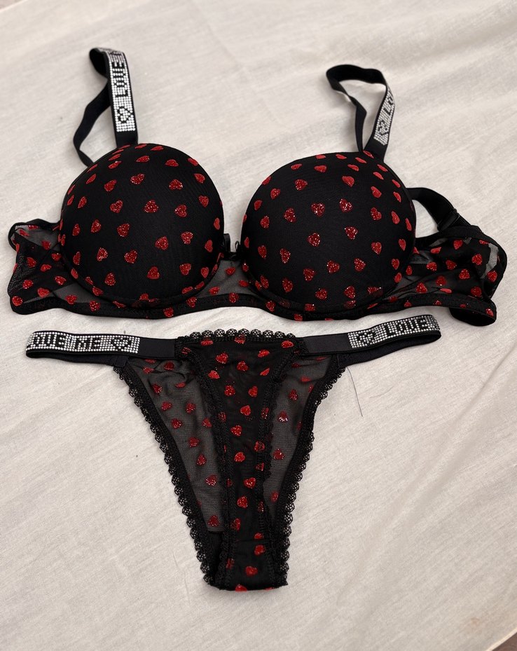 Koyu kırmızı desenli sütyen ve tanga takımı, kısa kesim ve 'LOVE' yazılı siyah askılar içerir. Gotik tarzda, göz alıcı bir görünüm sunar. ❤️