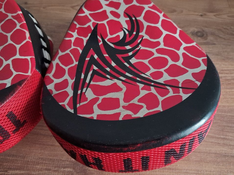 Kırmızı Delme El hedef Vuruş kalkanı, siyah tribal desenli ve dayanıklı kumaş kenarlıklı.