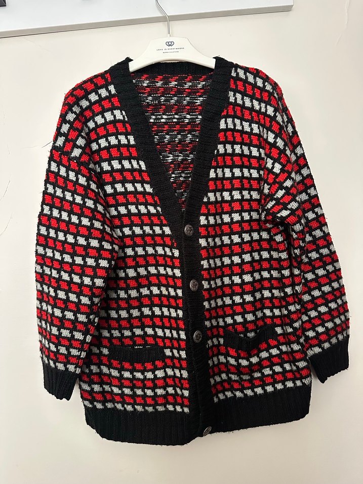 Koyu kırmızı, siyah ve gri tonlarda desenli, bol kesim örgü kadın hırka. Uzun kollu, yakalı ve midi boyda, günlük kullanıma uygun sıcak tutar.